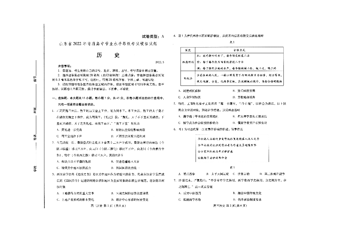 山东省潍坊市2022.5高三年级第三次模拟试题历史