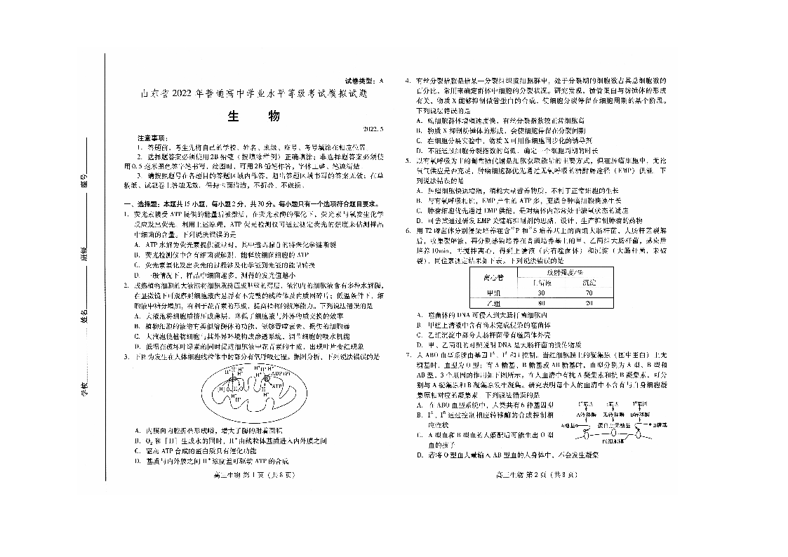 山东省潍坊市2022.5高三年级第三次模拟试题生物