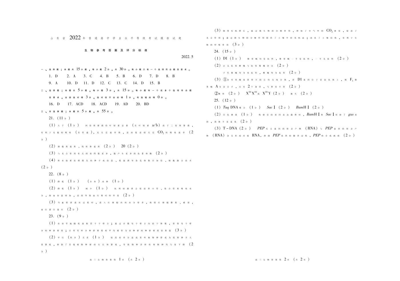 山东省潍坊市2022.5高三年级第三次模拟试题生物答案