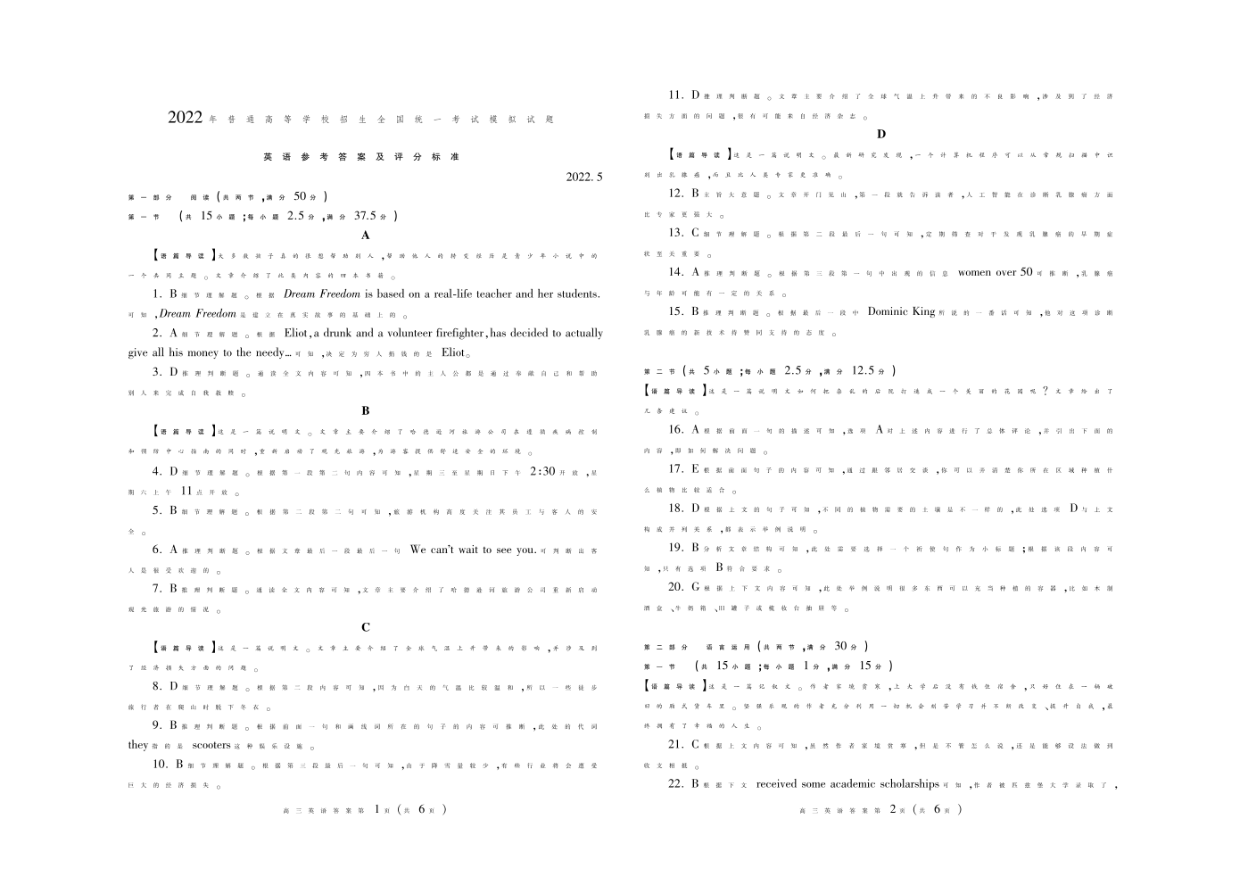 山东省潍坊市2022.5高三年级第三次模拟试题英语答案
