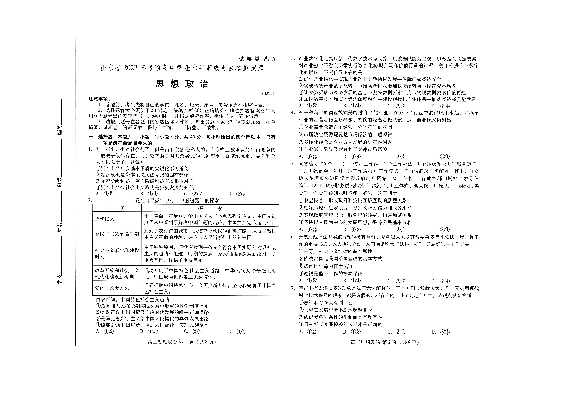 山东省潍坊市2022.5高三年级第三次模拟试题政治