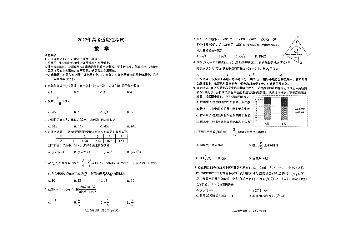 山东省烟台市2022.5高三年级第三次模拟试题数学