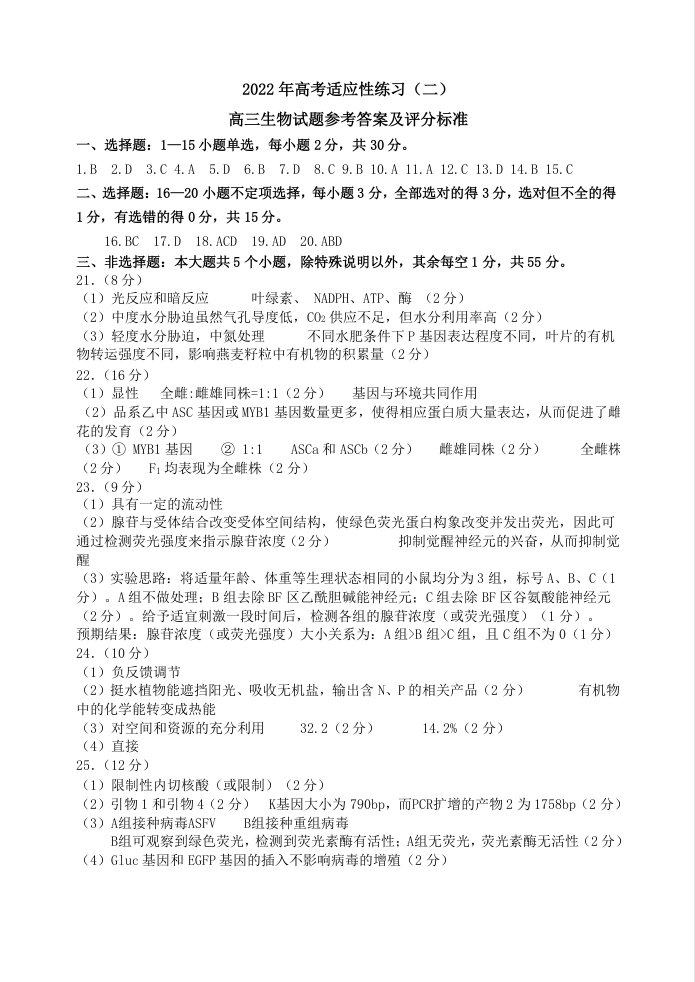 山东省烟台市2022.5高三年级第三次模拟试题生物答案