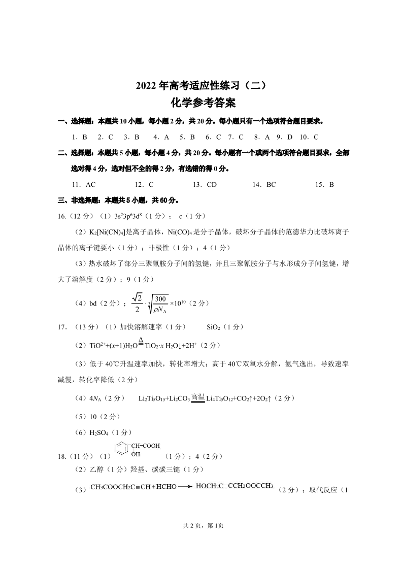 山东省烟台市2022.5高三年级第三次模拟试题化学答案