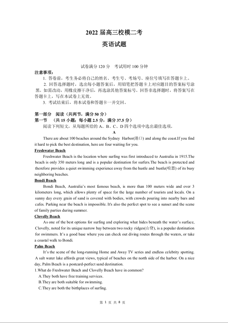 山东省实验中学2022.5高三年级校模二考试题英语