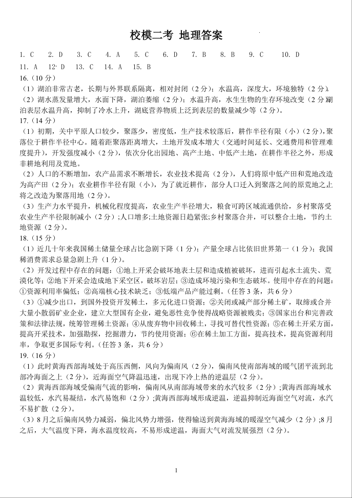 山东省实验中学2022.5高三年级校模二考试题地理答案