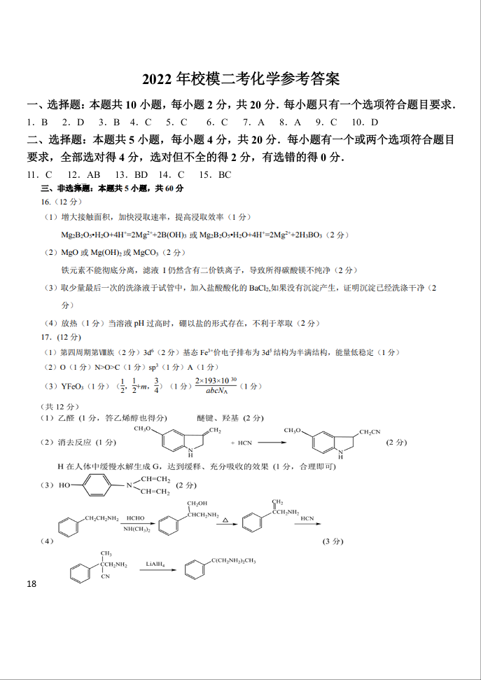 山东省实验中学2022.5高三年级校模二考试题化学答案