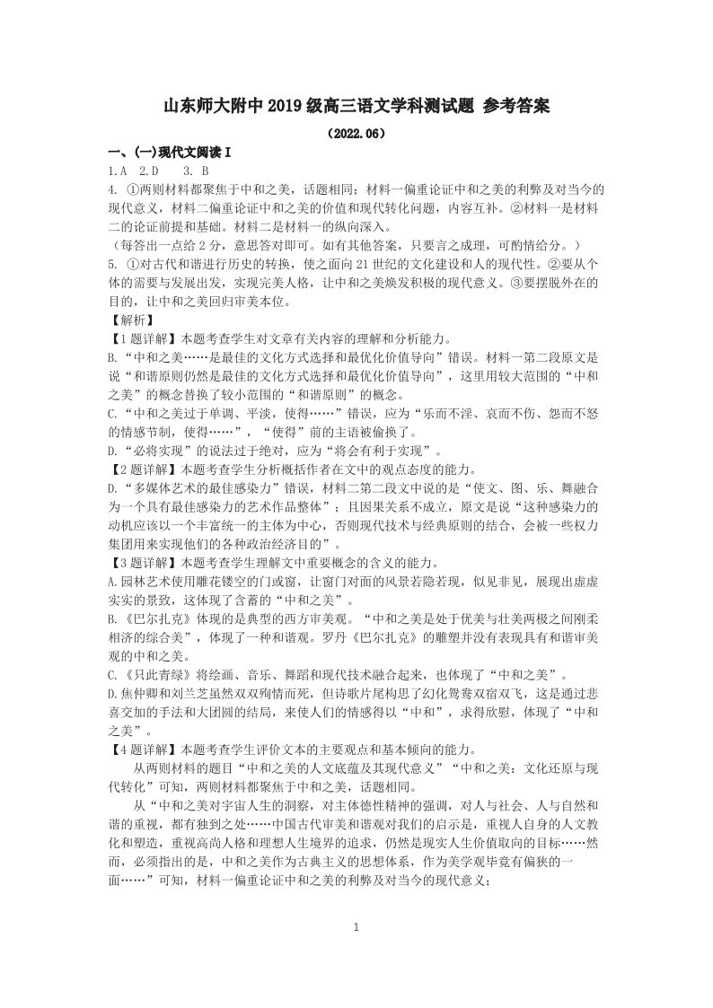 山东省师大附中2022.6高三年级考前模拟检测语文答案