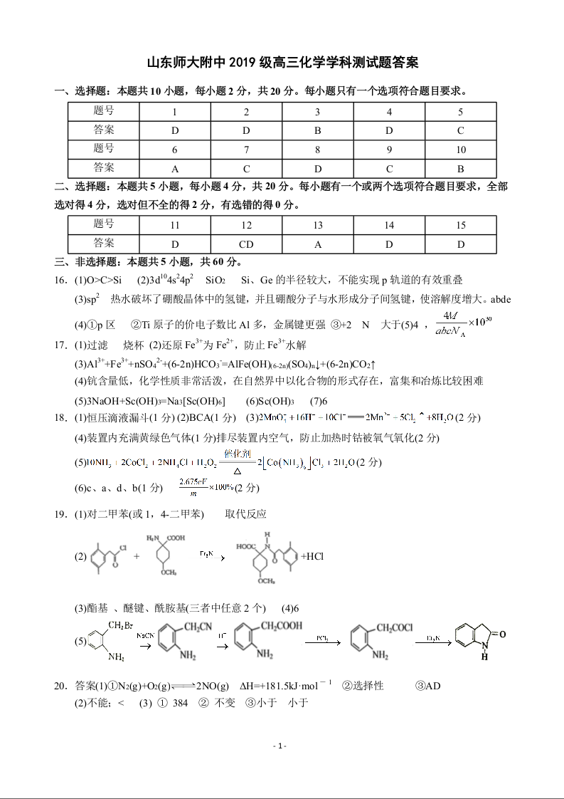 山东省师大附中2022.6高三年级考前模拟检测化学答案