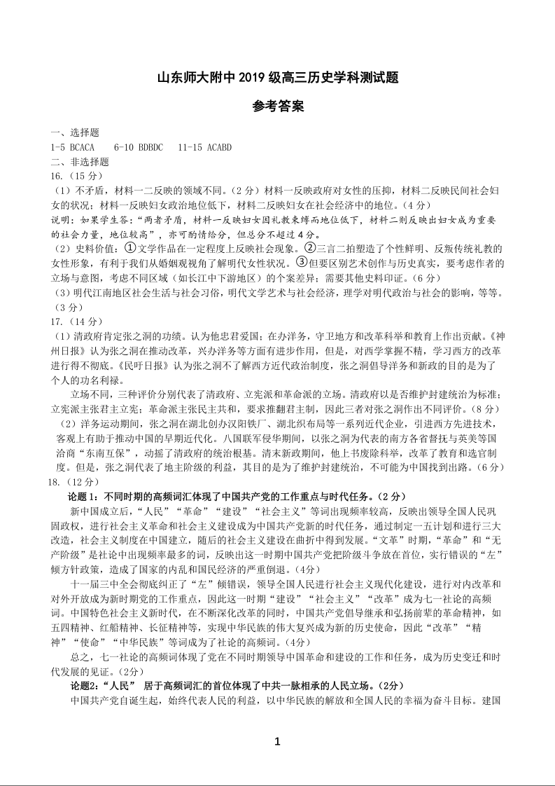 山东省师大附中2022.6高三年级考前模拟检测历史答案