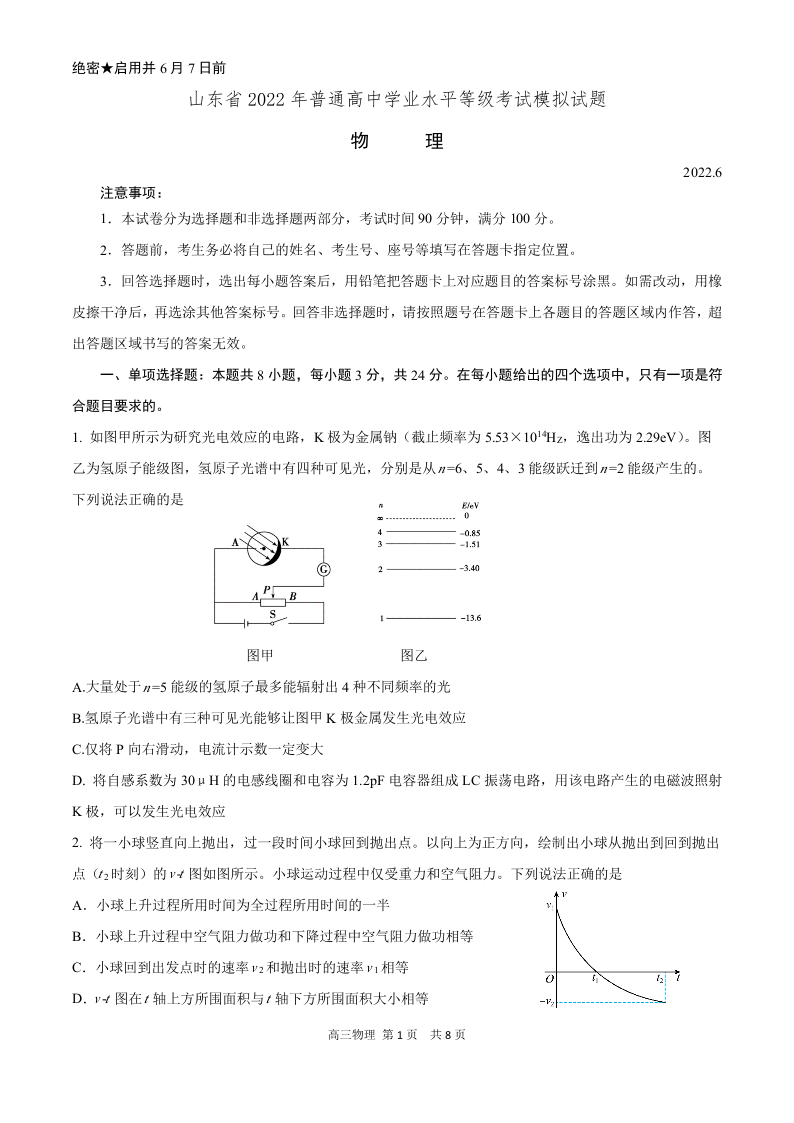 山东省师大附中2022.6高三年级考前模拟检测物理