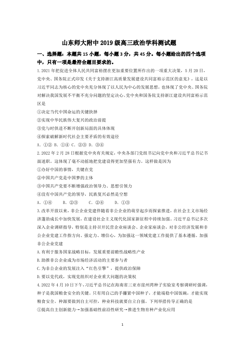 山东省师大附中2022.6高三年级考前模拟检测政治