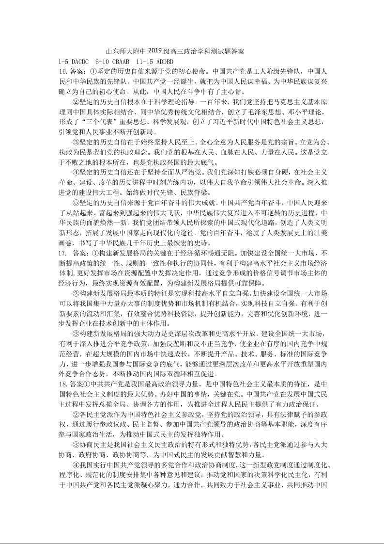 山东省师大附中2022.6高三年级考前模拟检测政治答案