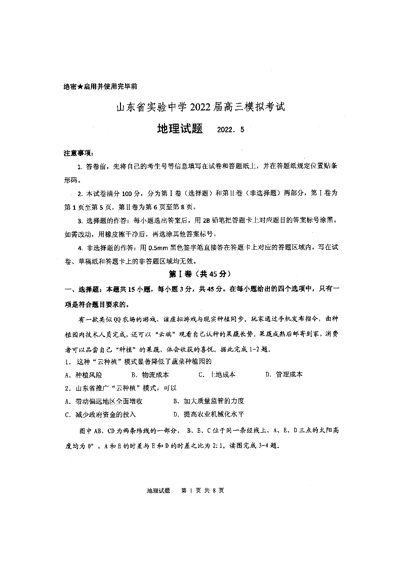 山东省实验中学2022.6高三年级考前模拟检测地理