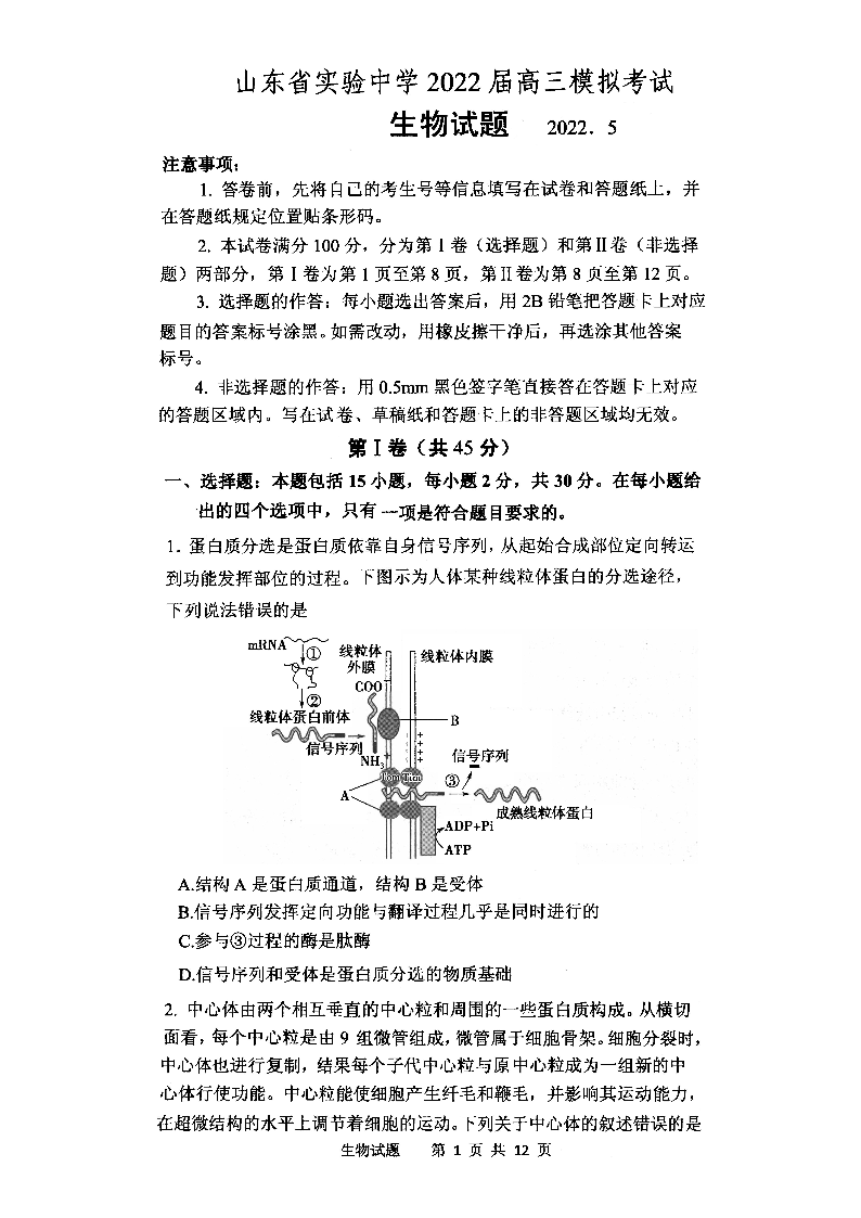 山东省实验中学2022.6高三年级考前模拟检测生物