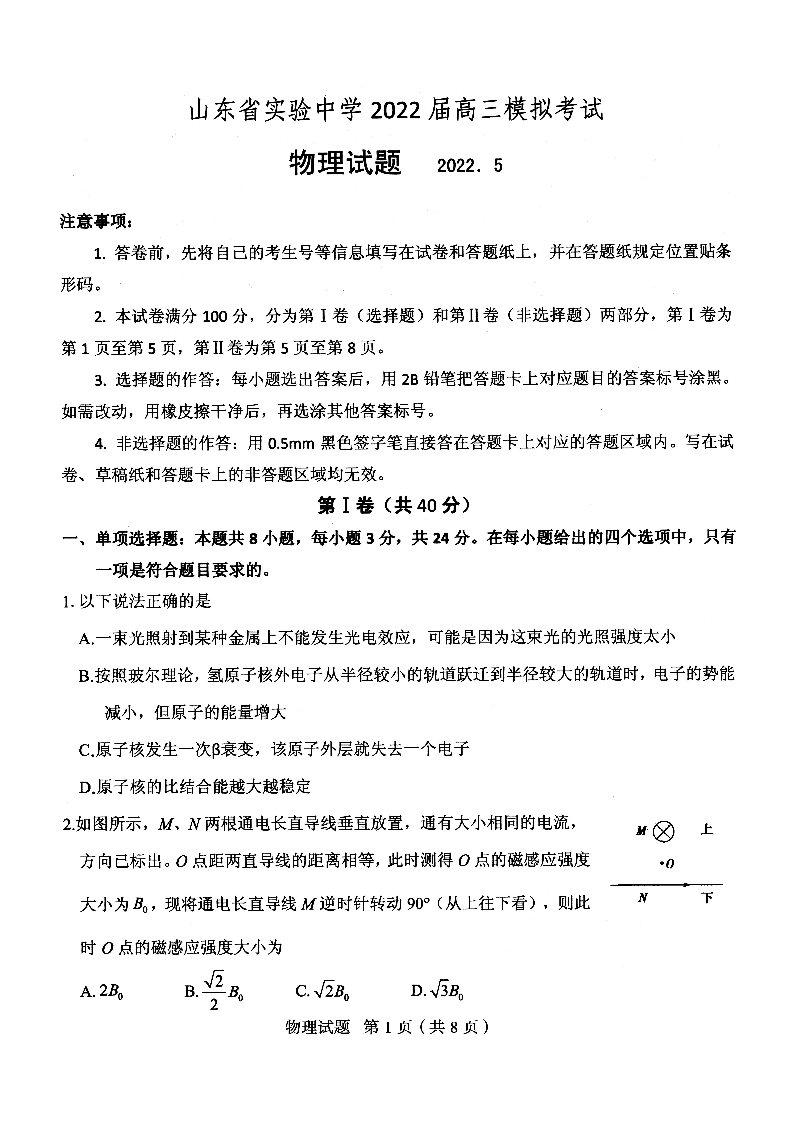 山东省实验中学2022.6高三年级考前模拟检测物理