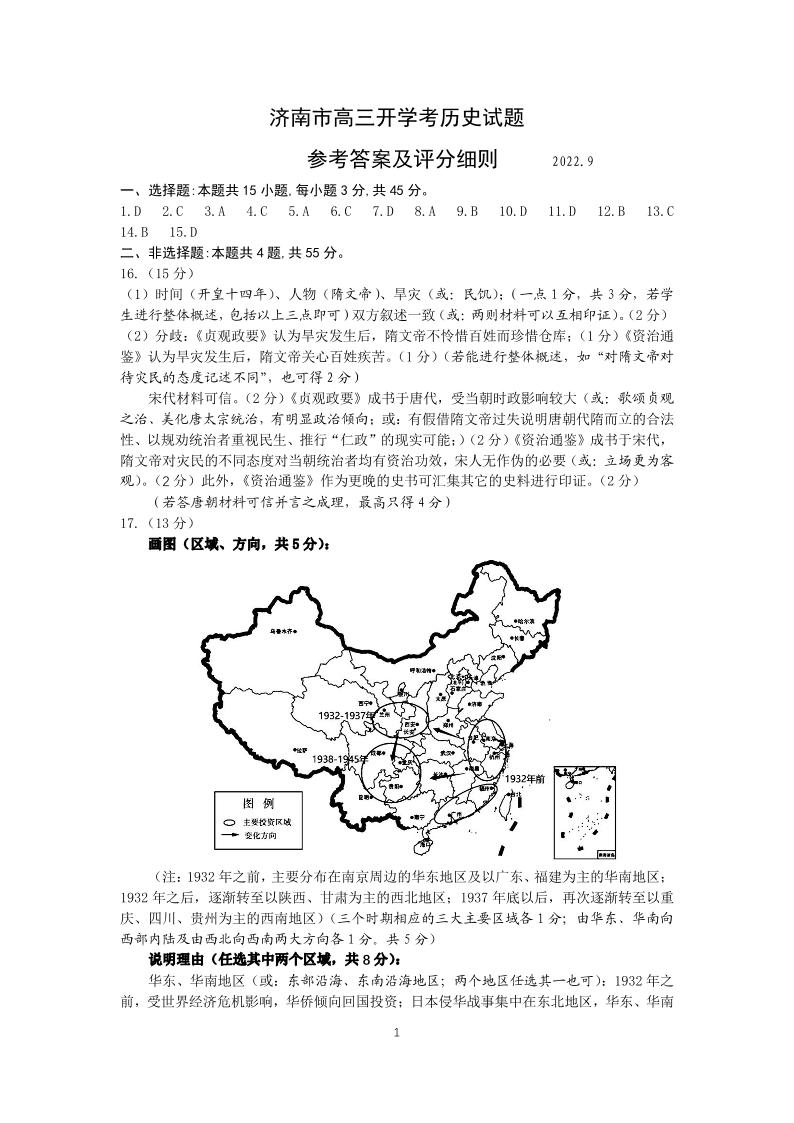 8山东省济南市2022.9高二年级开学摸底检测历史答案