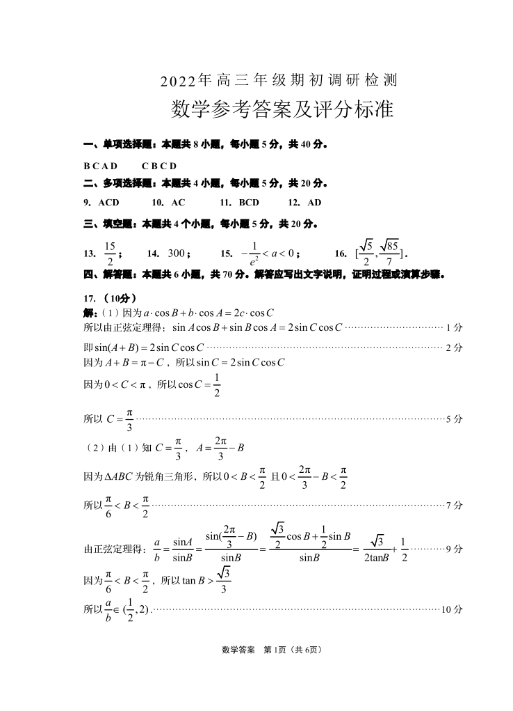 2山东省青岛市2022.9高三年级期初调研检测数学答案