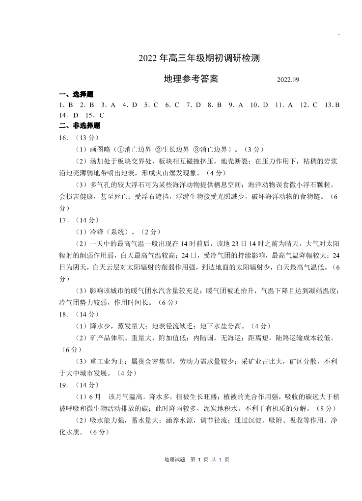 山东省青岛市2022.9高三年级期初调研检测地理答案