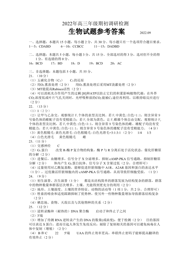 山东省青岛市2022.9高三年级期初调研检测生物答案