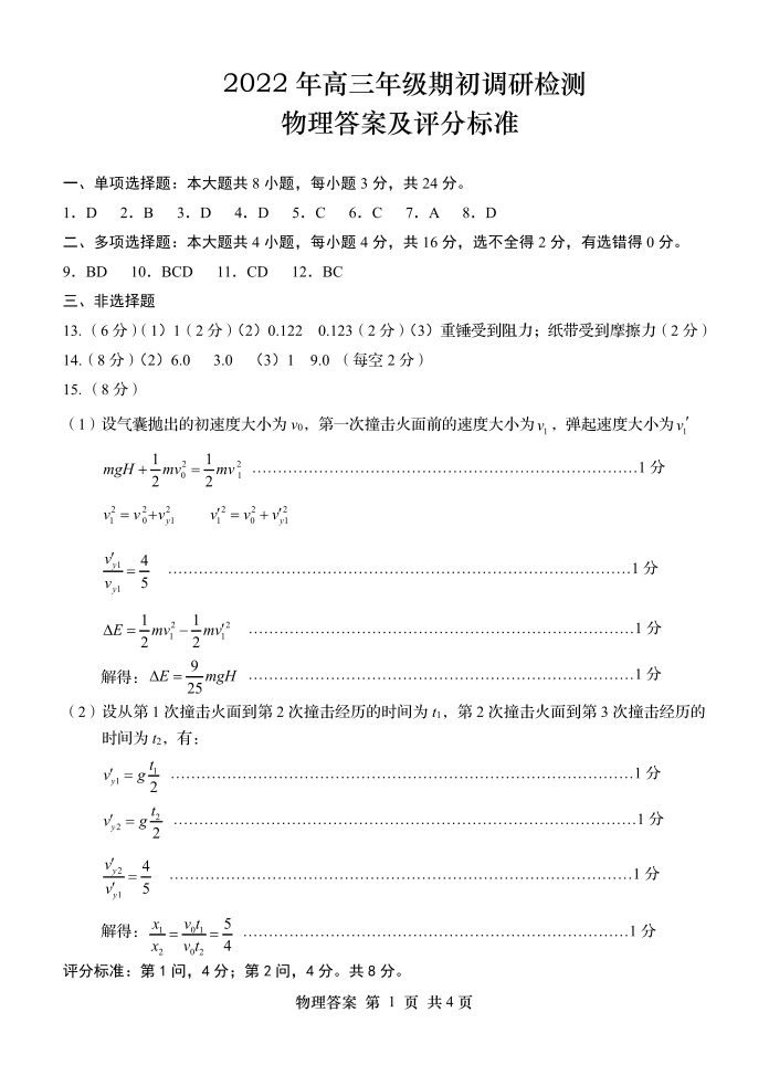 山东省青岛市2022.9高三年级期初调研检测物理答案