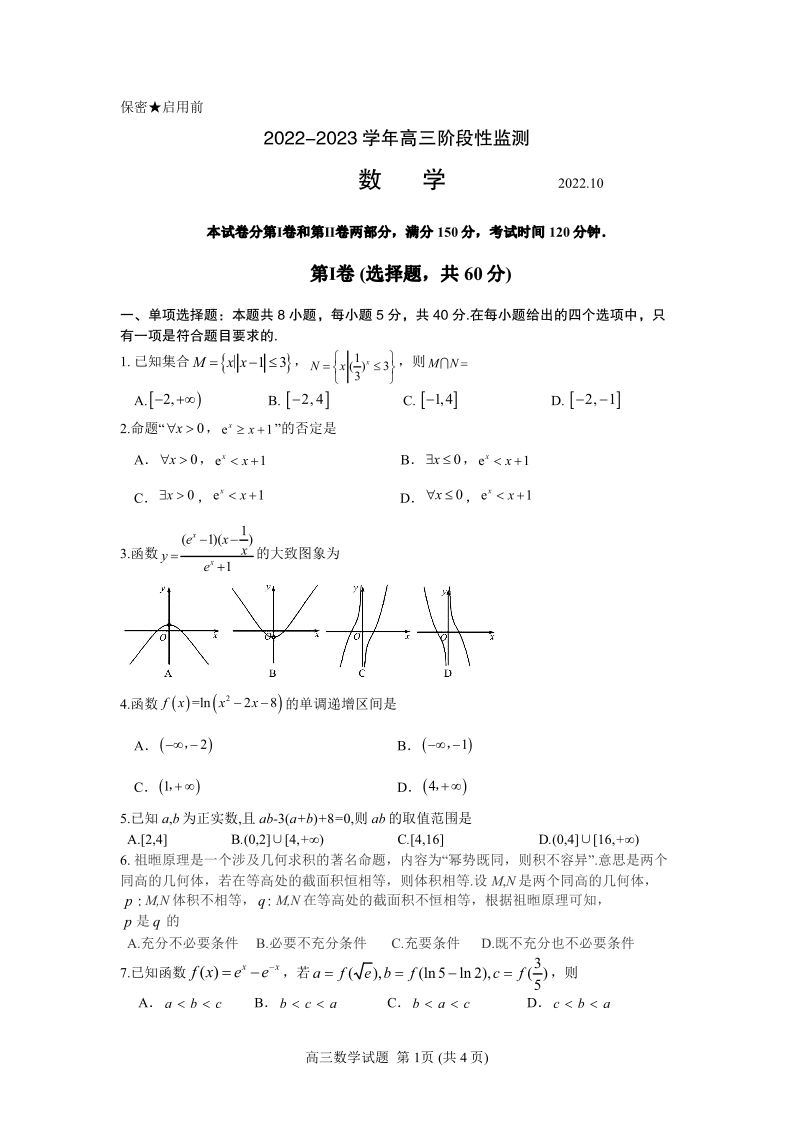 2山东省潍坊市区域2022.10高三年级质量监测数学