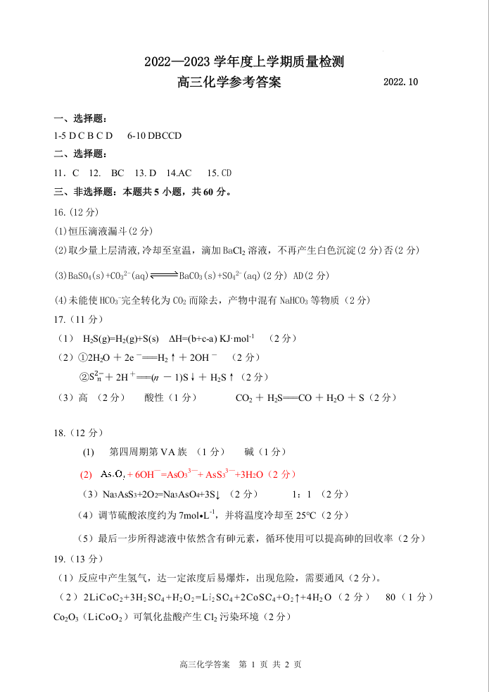 山东省潍坊市区域2022.10高三年级质量监测化学答案