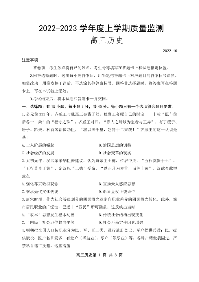 山东省潍坊市区域2022.10高三年级质量监测历史