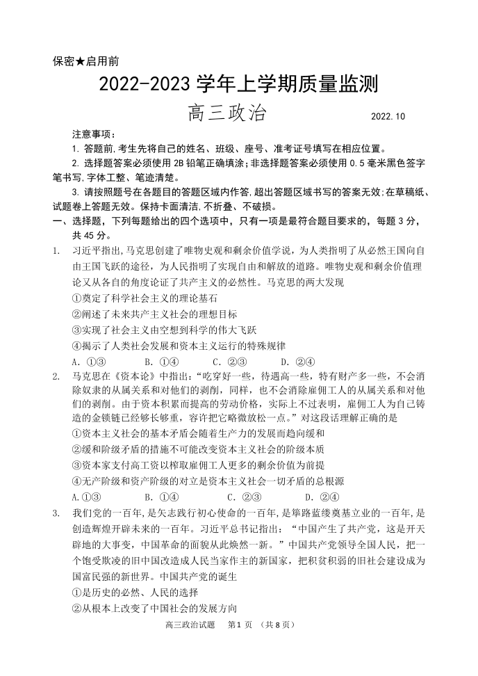 山东省潍坊市区域2022.10高三年级质量监测政治