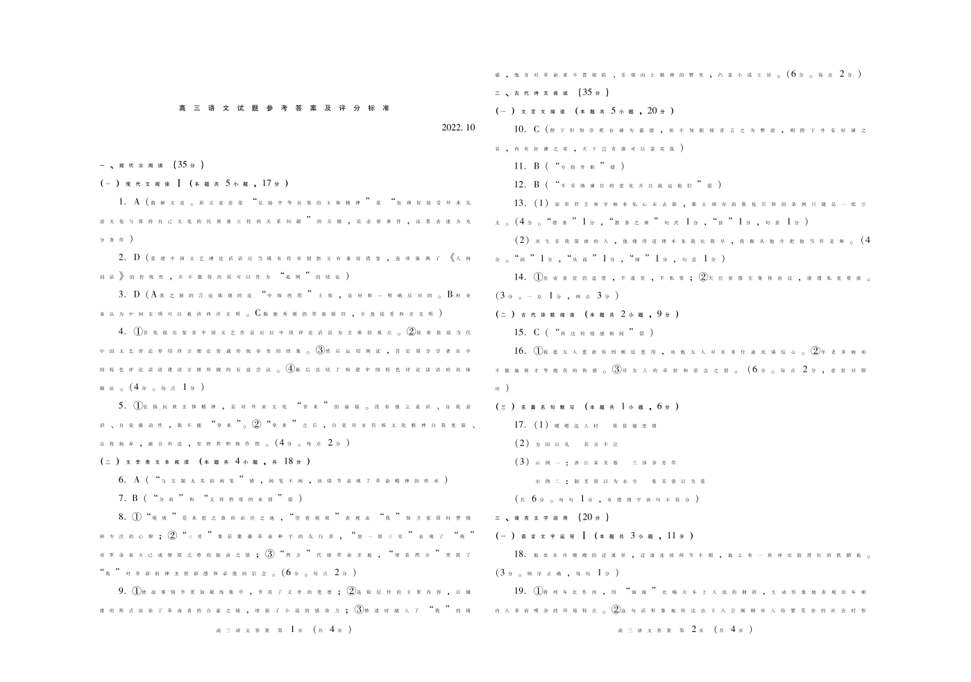 1山东省潍坊市2022.10高三年级优生监测语文答案