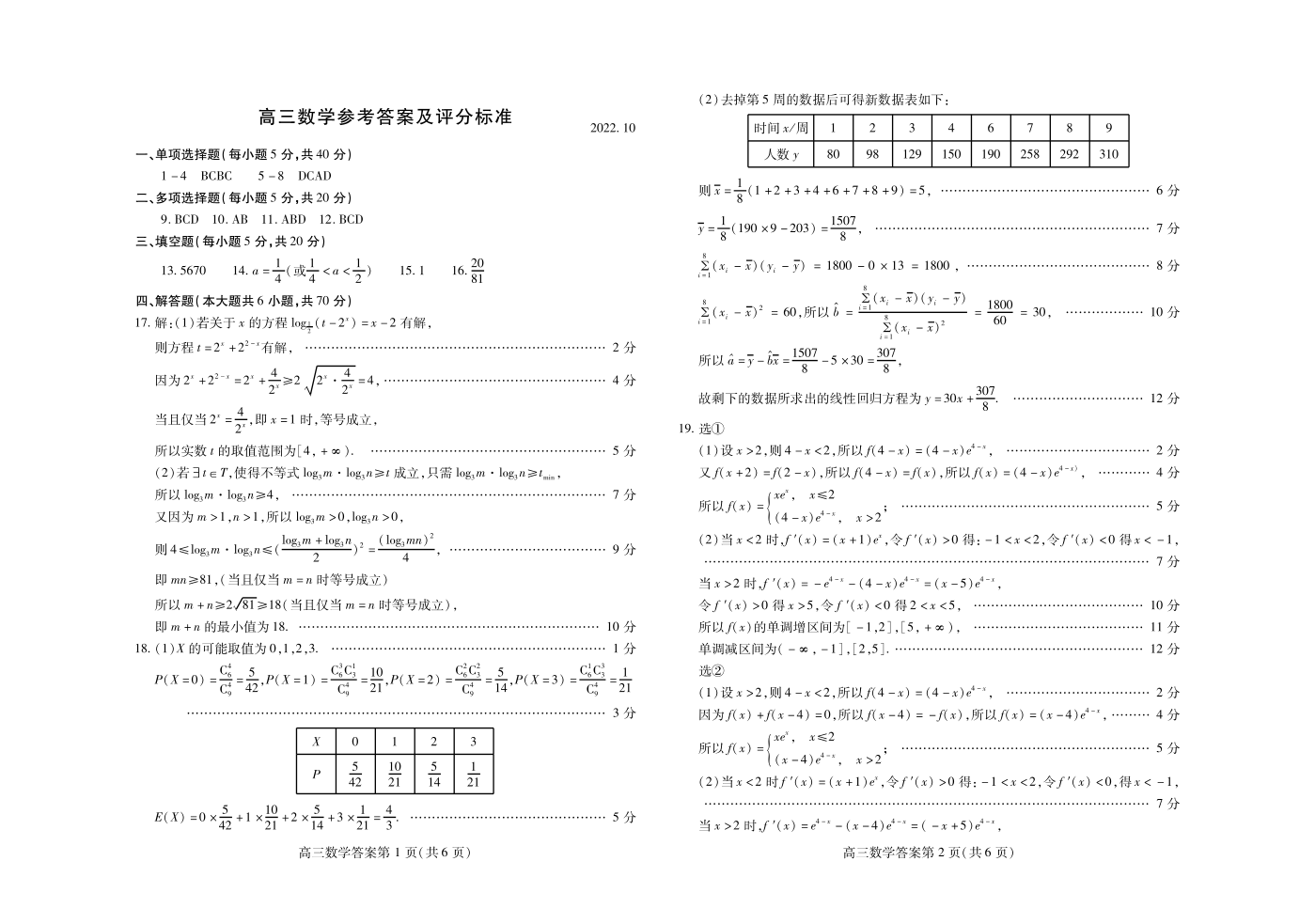 2山东省潍坊市2022.10高三年级优生监测数学答案