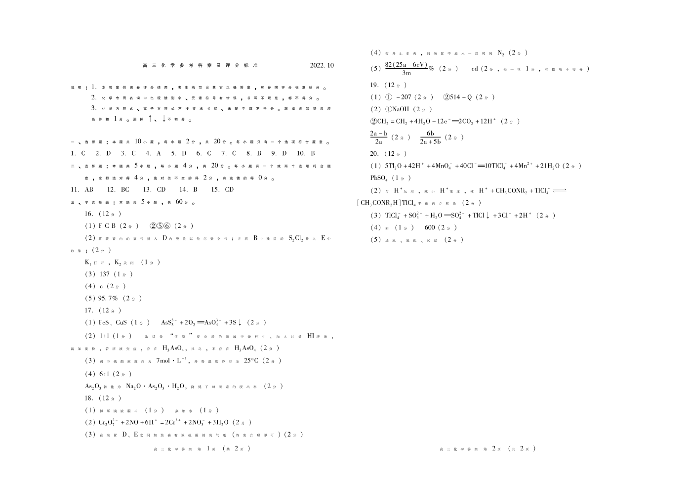 5山东省潍坊市2022.10高三年级优生监测化学答案