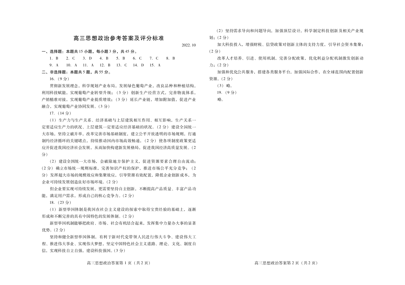 7山东省潍坊市2022.10高三年级优生监测政治答案