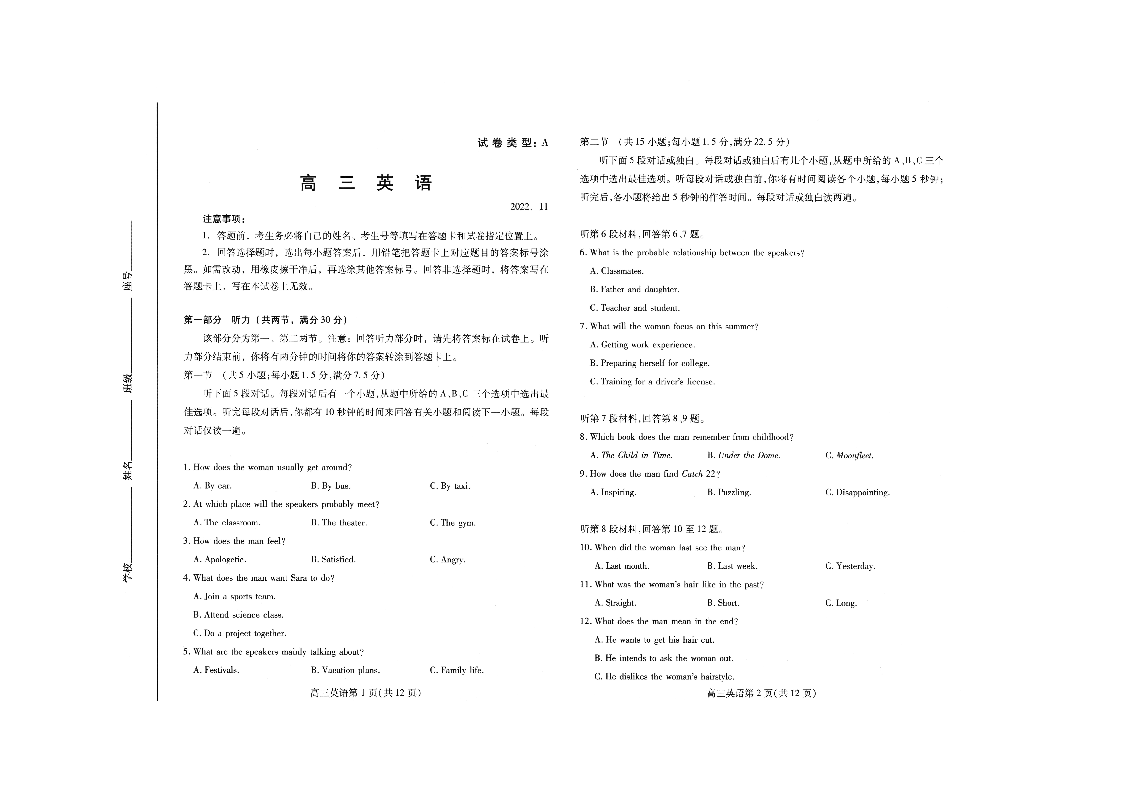 3山东省潍坊市2022.11高三年级期中考试英语