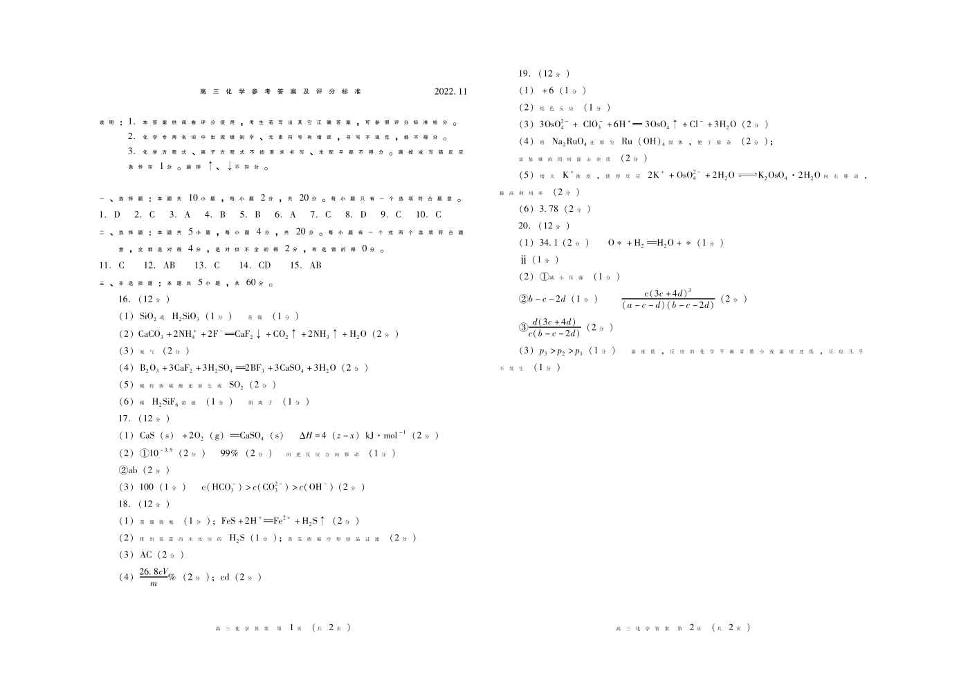 山东省潍坊市2022.11高三年级期中考试化学答案