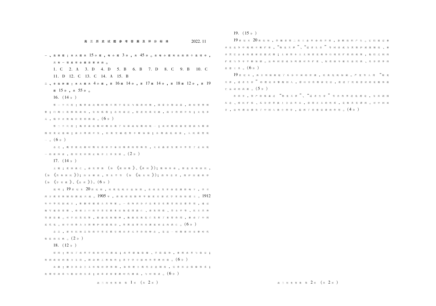山东省潍坊市2022.11高三年级期中考试历史答案