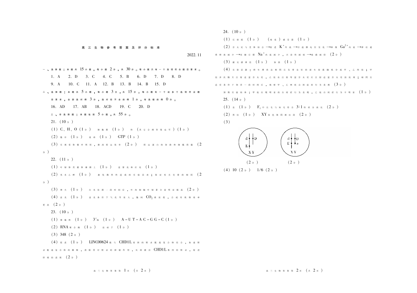 山东省潍坊市2022.11高三年级期中考试生物答案