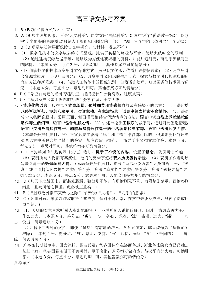 1山东省淄博市2022.12高三年级期末考试语文答案