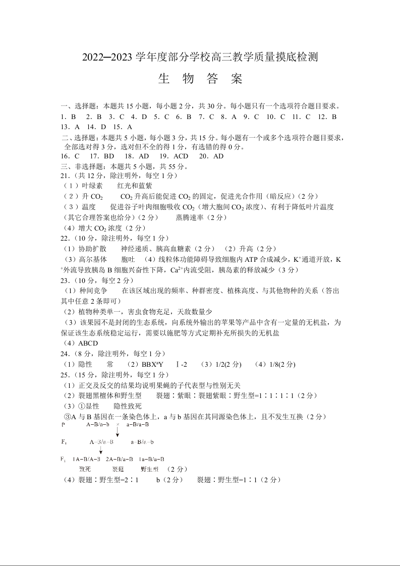 山东省淄博市2022.12高三年级期末考试生物答案
