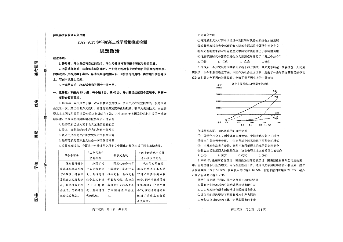 山东省淄博市2022.12高三年级期末考试政治
