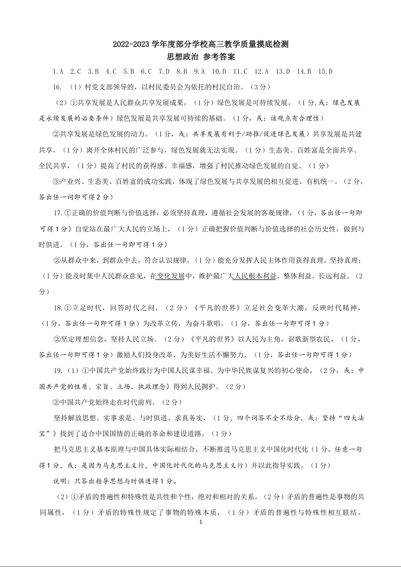 山东省淄博市2022.12高三年级期末考试政治答案