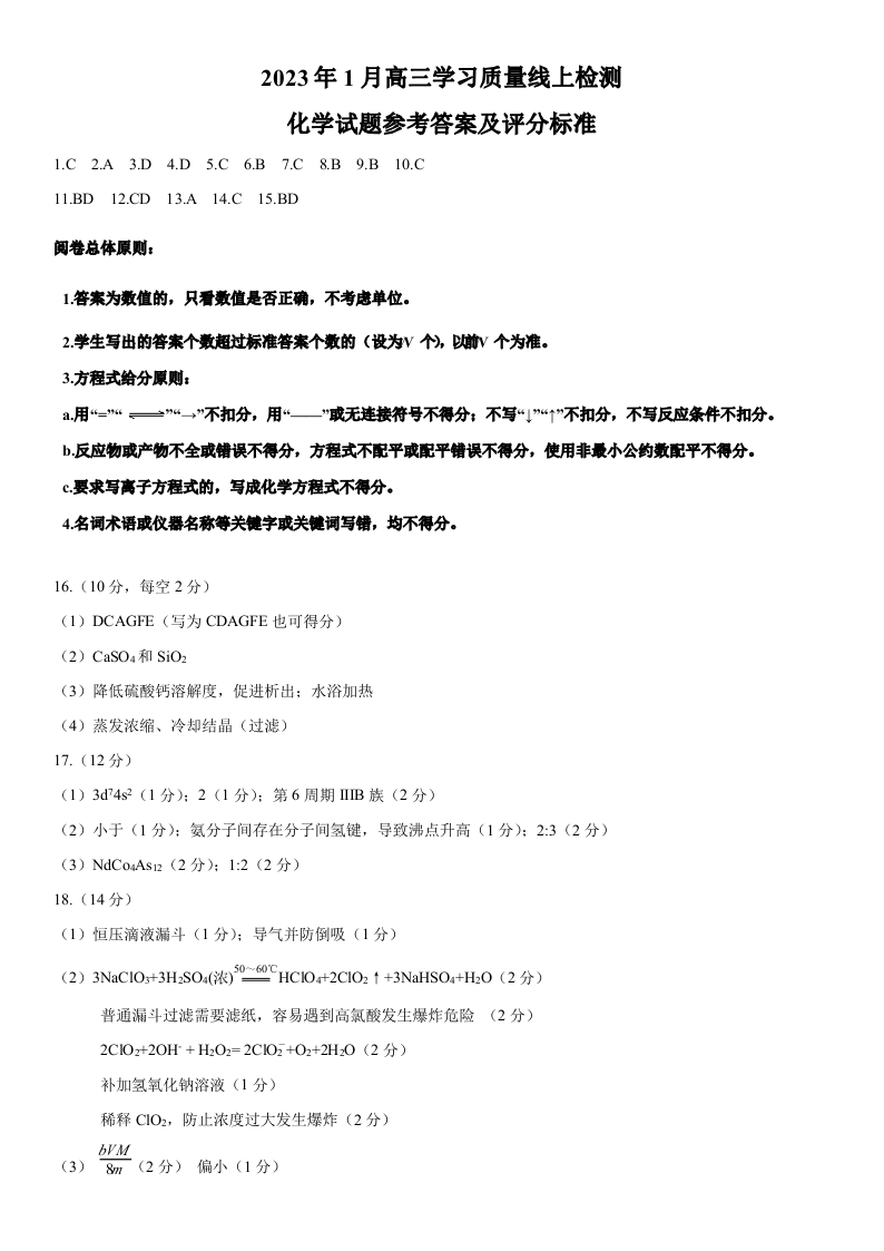 山东省济南市2023.1高三年级期末考试化学答案