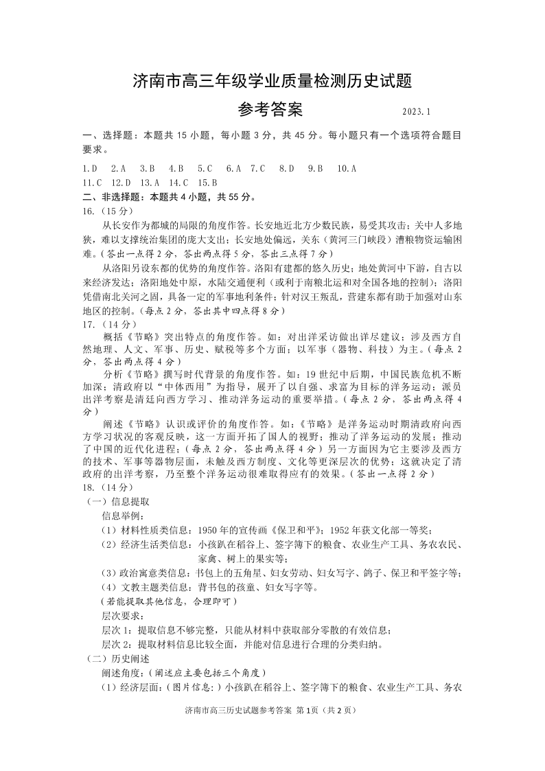 山东省济南市2023.1高三年级期末考试历史答案