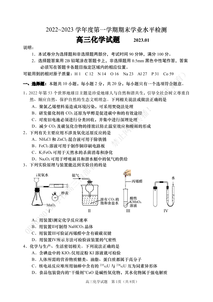 山东省青岛市2023.1高三年级期末考试化学