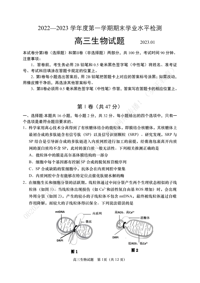 山东省青岛市2023.1高三年级期末考试生物
