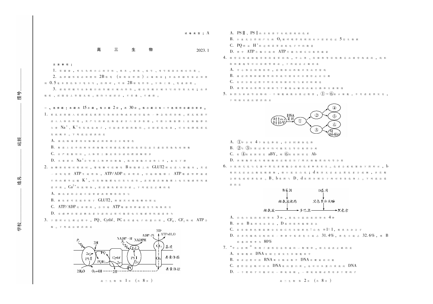 山东省潍坊市2023.1高三年级期末考试生物