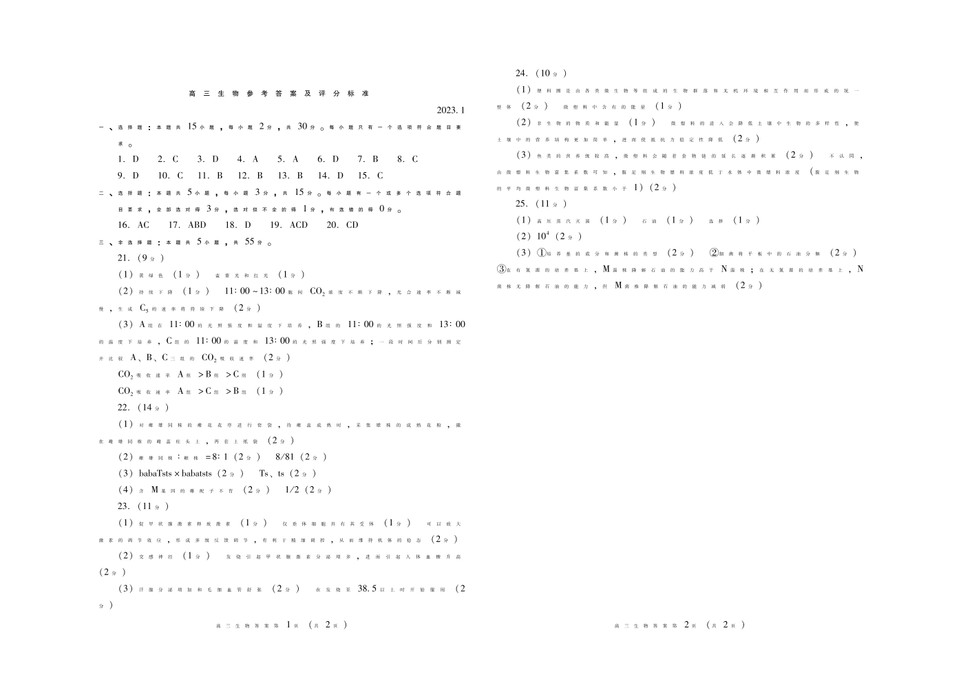 山东省潍坊市2023.1高三年级期末考试生物答案