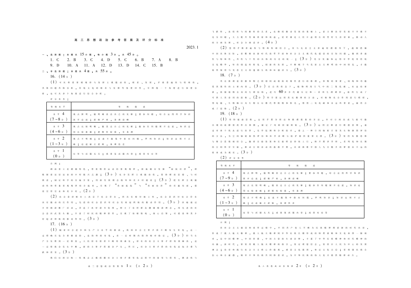 山东省潍坊市2023.1高三年级期末考试政治答案