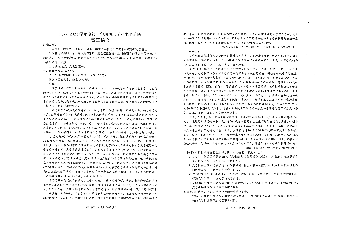 1山东省烟台市2023.1高三年级期末考试语文