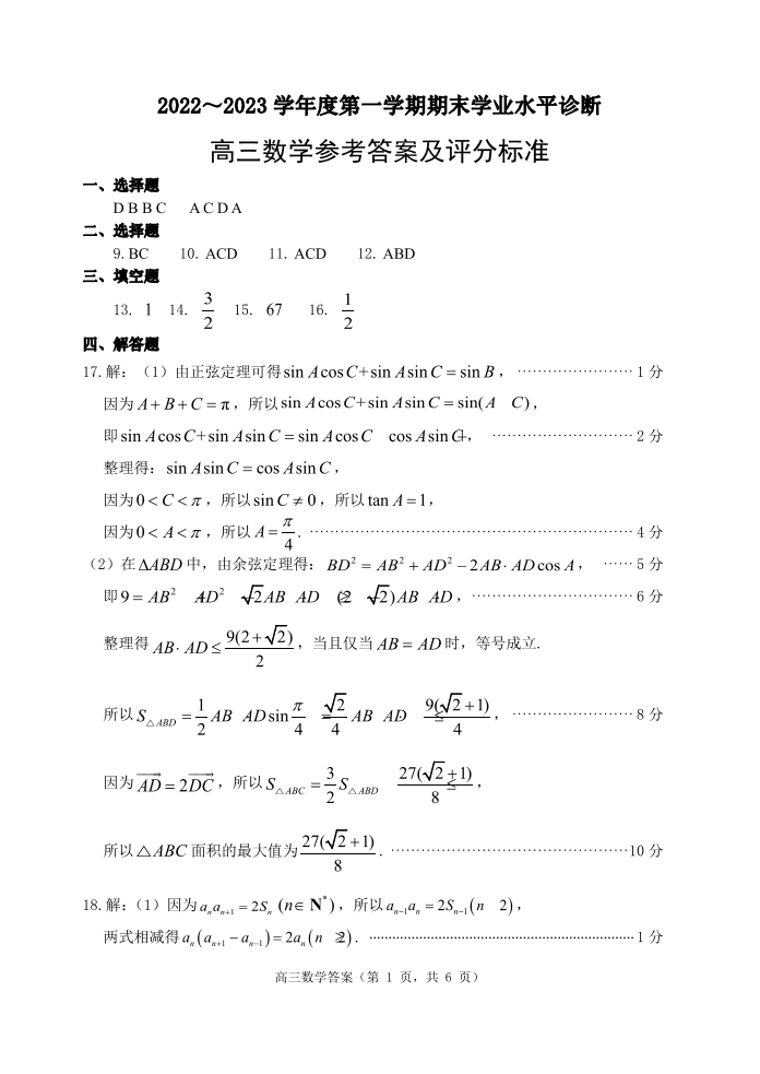 2山东省烟台市2023.1高三年级期末考试数学答案